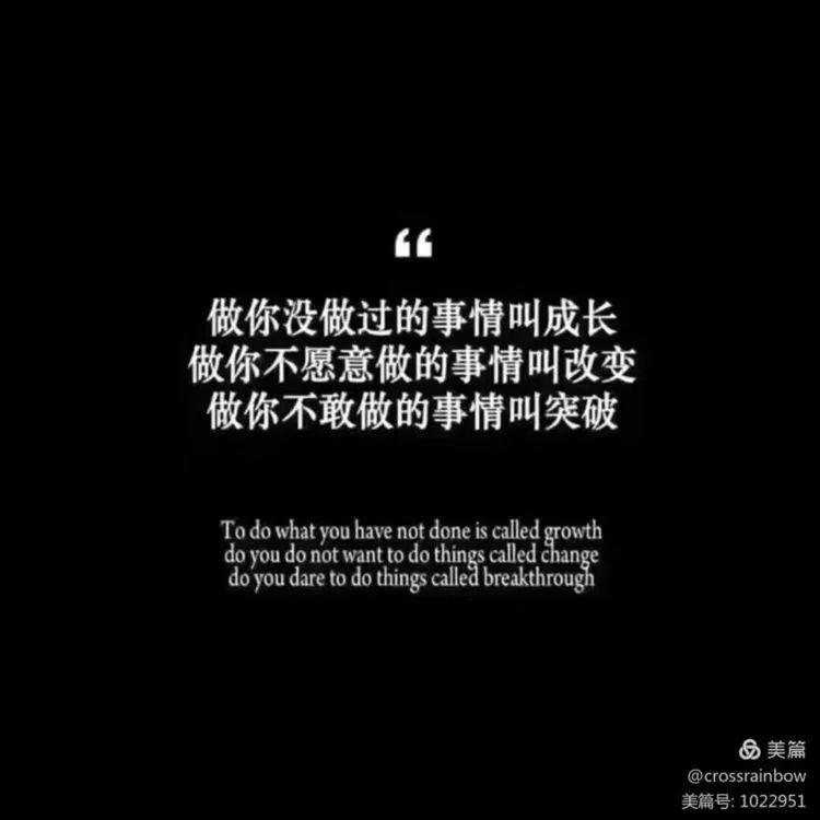 做你没做过的事情叫成长,做你不愿意做的事情叫改变,做你不敢做的事情叫突破。人生充满了曲折与不定;没有尝试,谁也不知道结果如何。因此,我们在人生道路上,要勇于尝试,敢于探索。只有这样,才能不断前进,取得成果。要敢于突破自己,去寻找真正属于自己的路,敢于去打破约束的牢笼。